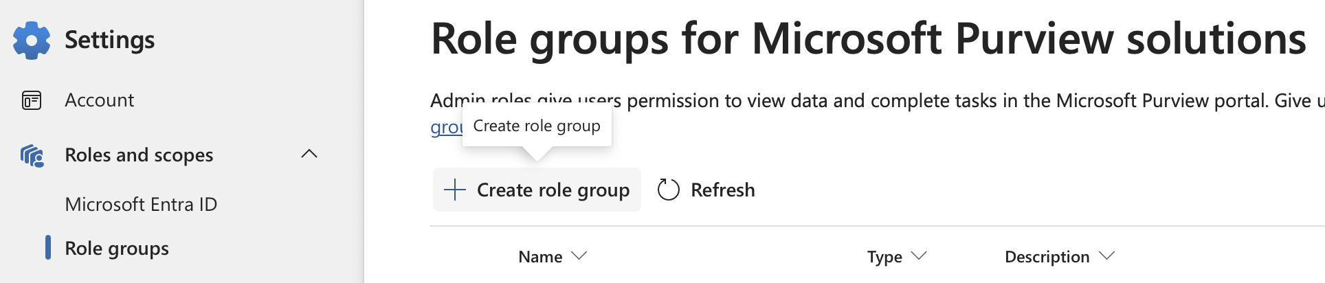 Within the Purview portal, go to Settings, Roles and scope, Role groups, and select "Create role group":