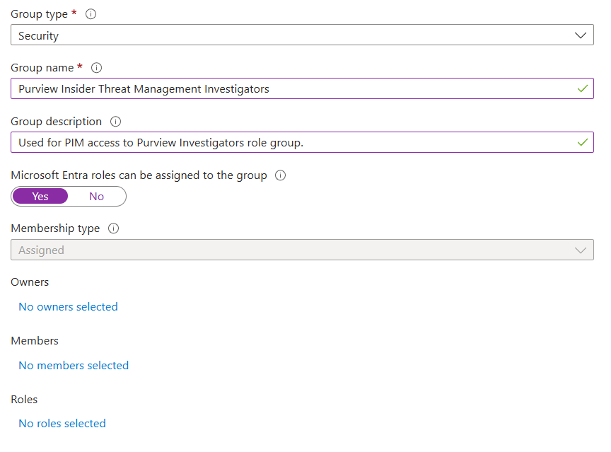 To time-gate access to the Insider Risk Management Investigators role group within Purview, an associated Entra group must be created (Entra ID > Manage > Groups) [Link]. It's important that "Microsoft Entra roles can be assigned to the group" is toggled to "Yes", so individuals can activate assignment to this resource through Azure PIM.