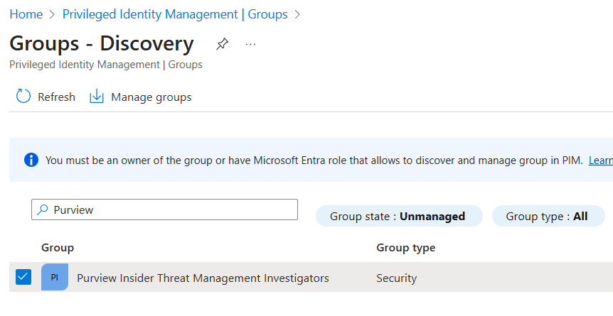In the PIM portal, select "Groups" then "Discover groups" (PIM > Manage > Groups) [Link]: