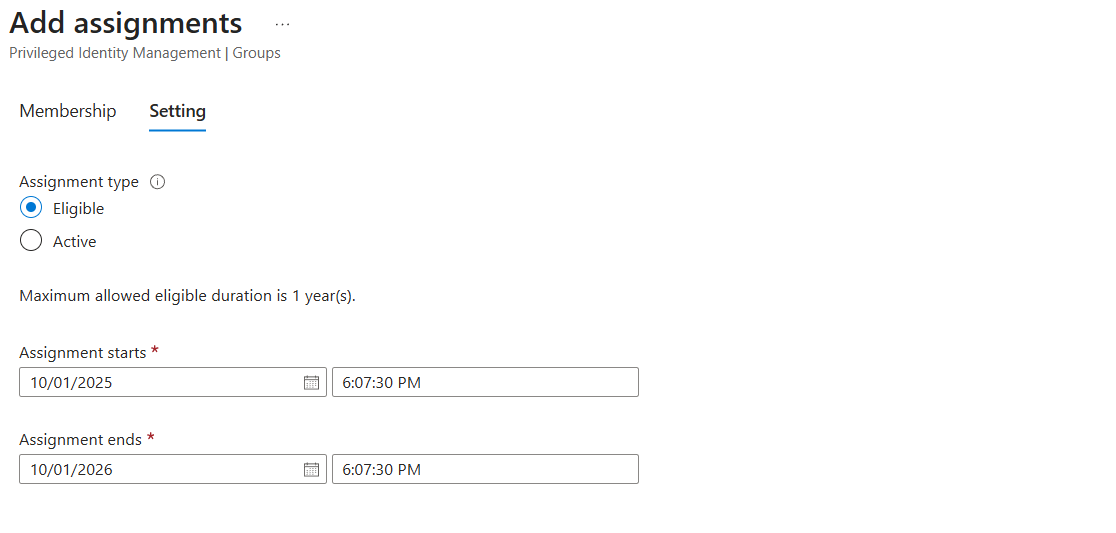 On the next page, ensure "Assignment type" is set to "Eligible" so this membership is not permanent, and must be activated. The assignment start and end dates can be adjusted, but by default are set to the maximum eligibility timeframe of 1 year. It's important to note that because of this, users will need to be assigned to this group again in a year to maintain eligibility.