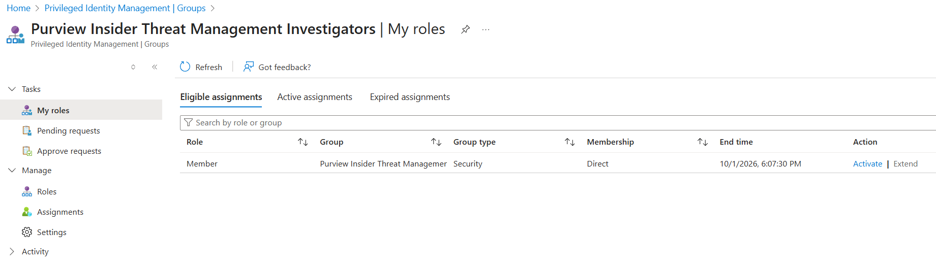 When a user needs to elevate to the Investigators Entra group to obtain Insider Risk Management Investigators permissions, they can navigate to the PIM portal, and they will see the Entra group as an eligible assignment. Clicking "Activate" will begin the elevation flow.