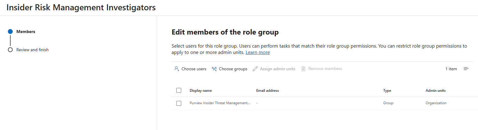 Now that the group has been created, we need to include it as a member of the Purview Insider Risk Management Investigators role group from within the Purview compliance portal (Purview compliance > Settings > Roles and scopes > Role groups > Insider Risk Management Investigators) [Link]:
