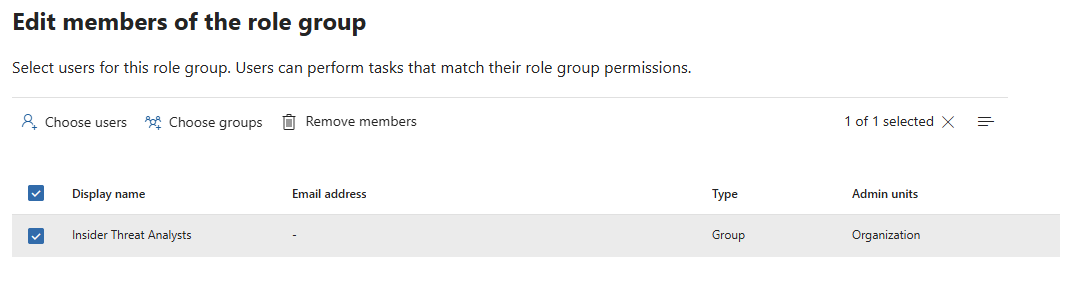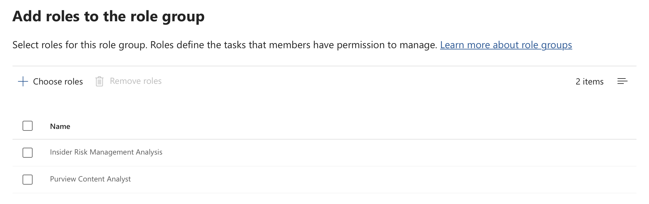 Next, roles can be selected to build out the permissions that members of the role group have. As per the example, both "Insider Risk Management Analysis" and "Purview Content Analyst" have been added.