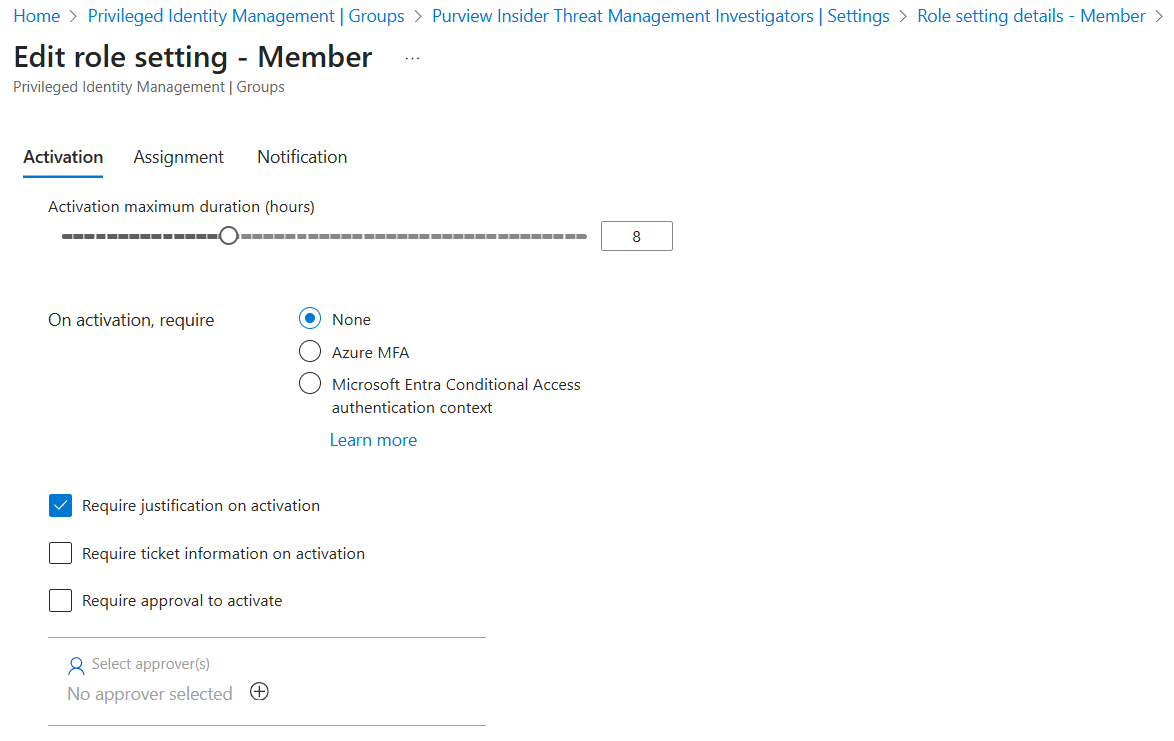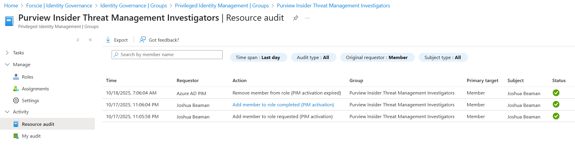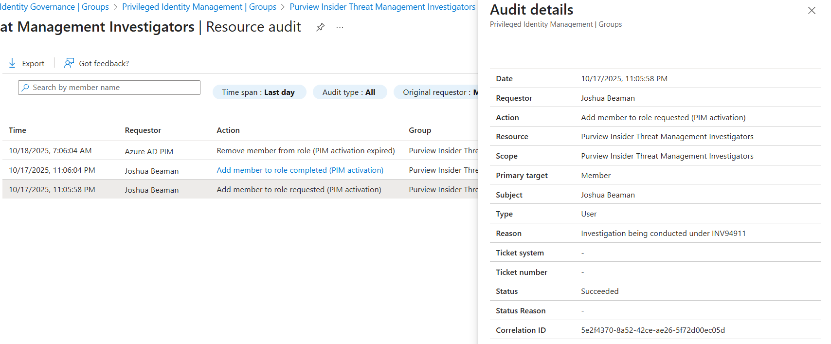 For organizations seeking to operationalize their insider threat programs with clarity and control, the ability to create custom role groups and implement just-in-time access through Entra PIM offers significant strategic value. These controls not only enforce least privilege and reduce standing access but also generate a detailed audit trail that supports investigation integrity and organizational accountability.