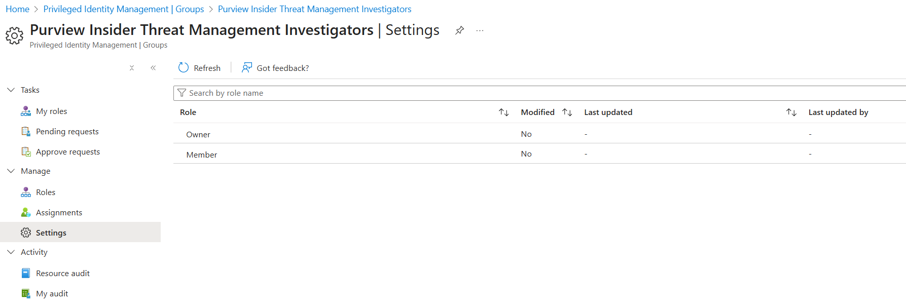 There are additional settings that can be configured, such as how a user activates the assignment, implementing an approval process, and more granular notifications to provide oversight. Select the relevant group, and under the Manage section on the left navigation menu, select Settings. While it is possible to edit settings for both Owners and Members of the group, as users are only eligible to activate the member role, this row should be clicked.