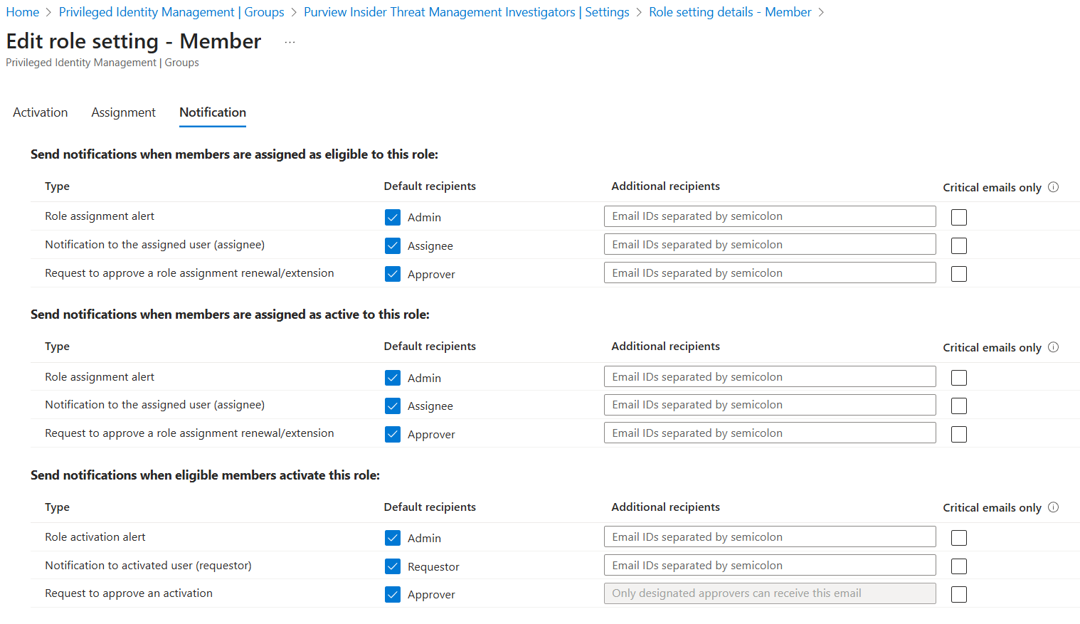 By default, all notifications have default recipients - additional recipients can be configured. Suppose approval for activations is not enabled, to enable immediate oversight. In that case, it may be appropriate to add the email address of the individual(s) responsible for the Insider Risk Program as an additional recipient.