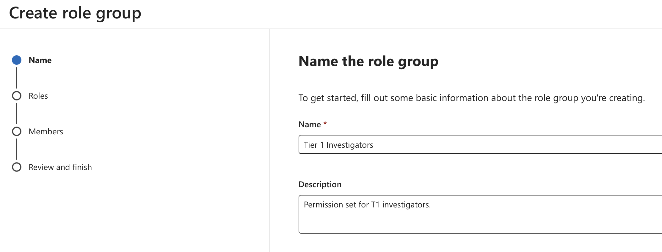 Assign the role group an appropriate name and description. In this example, a new role group is being created to take the base permission set for Insider Risk Management Analysts, and also providing the ability to access and view the content explorer.