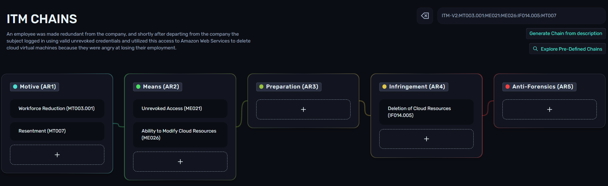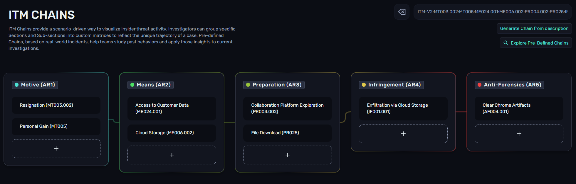 ITM Chains provide a scenario-driven way to visualize insider threat activity. Investigators can group specific Sections and Sub-sections into custom matrices to reflect the unique trajectory of a case. Pre-defined Chains, based on real-world incidents, help teams study past behaviors and apply those insights to current investigations.
